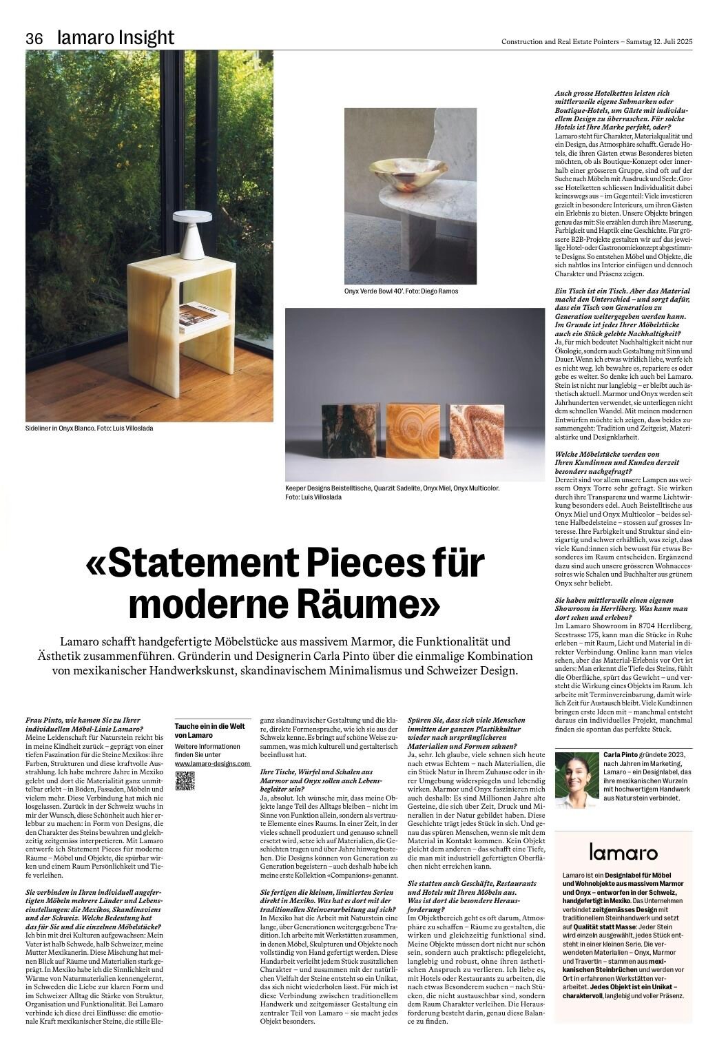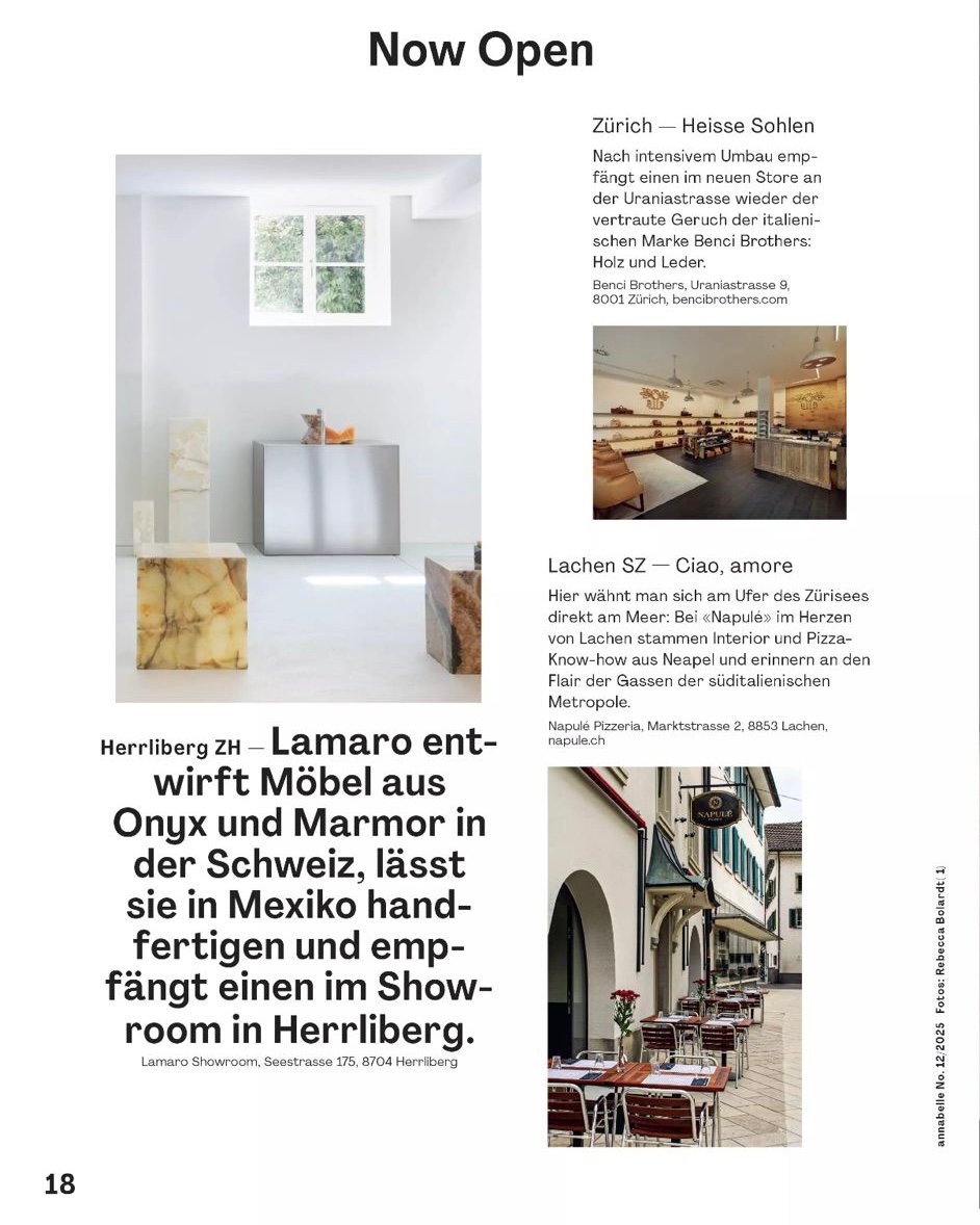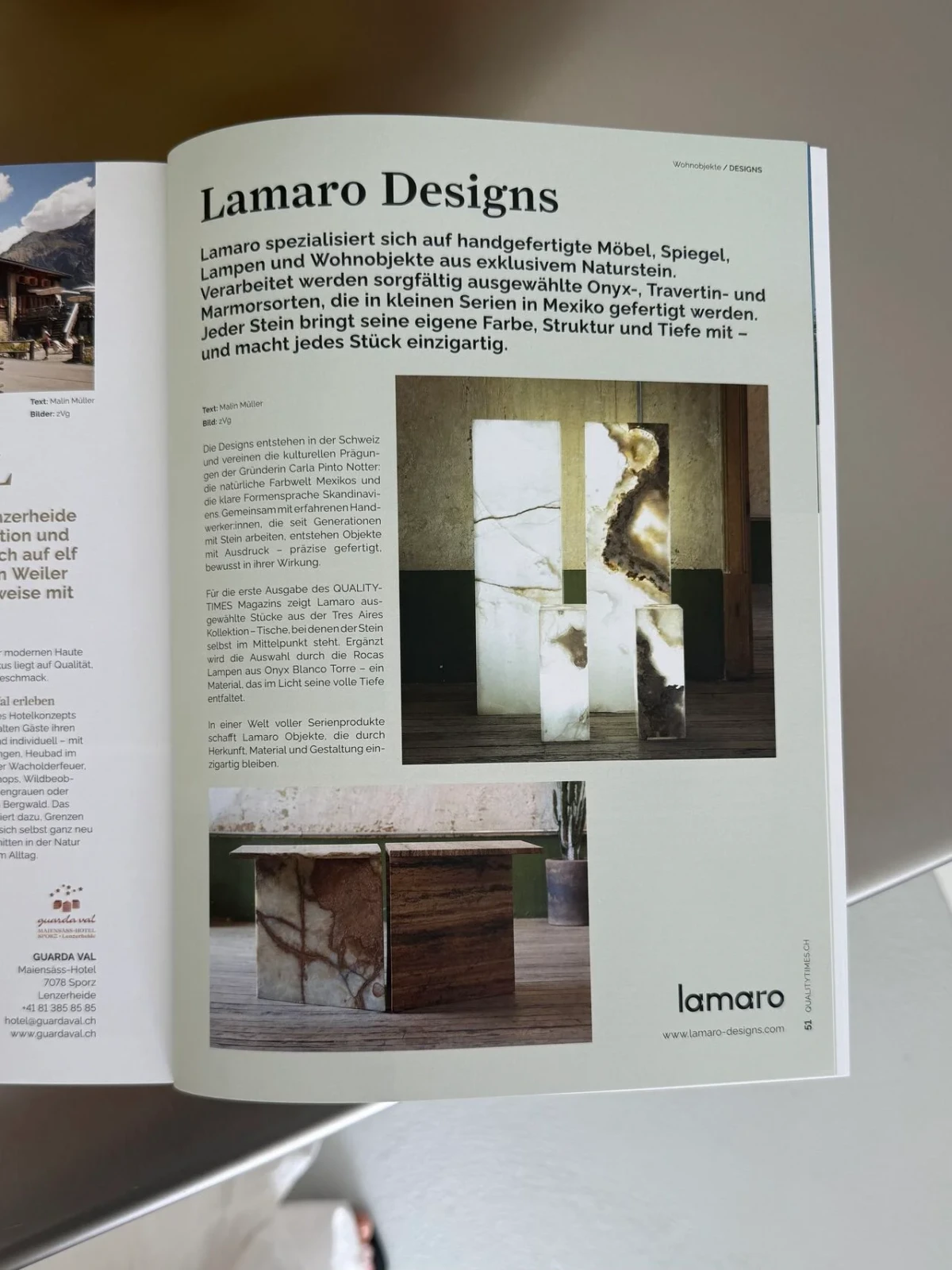 The Companions and Tres Aires collections include a selection of side tables, nightstands and coffee tables – designed in Switzerland and handcrafted in Mexico. Each piece is made from fine Onyx, Marble, Travertine or Quartzite, resulting in furniture with strong character and unique materiality. Every table is one of a kind – shaped by the natural texture of the stone and the precision of traditional craftsmanship. Lamaro furniture pieces are functional design objects with soul: clear in form, unique in expression. Produced in limited editions, they embody origin, quality and timeless elegance.