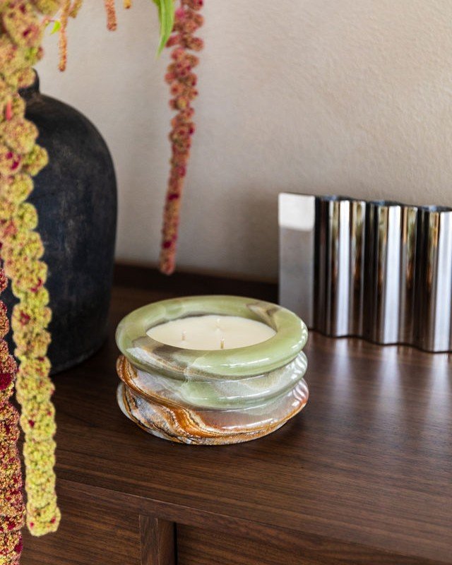 Crafted by hand from Mexican Onyx Verde, this candle is an object of striking presence. The stone reveals natural shades of green, making each piece a distinctive statement in its own right. Filled with an exclusive soy wax composition, it unites the strength of stone with the sensory experience of light and scent. Once the candle has burned down, the handcrafted stone body remains and can be beautifully reused.