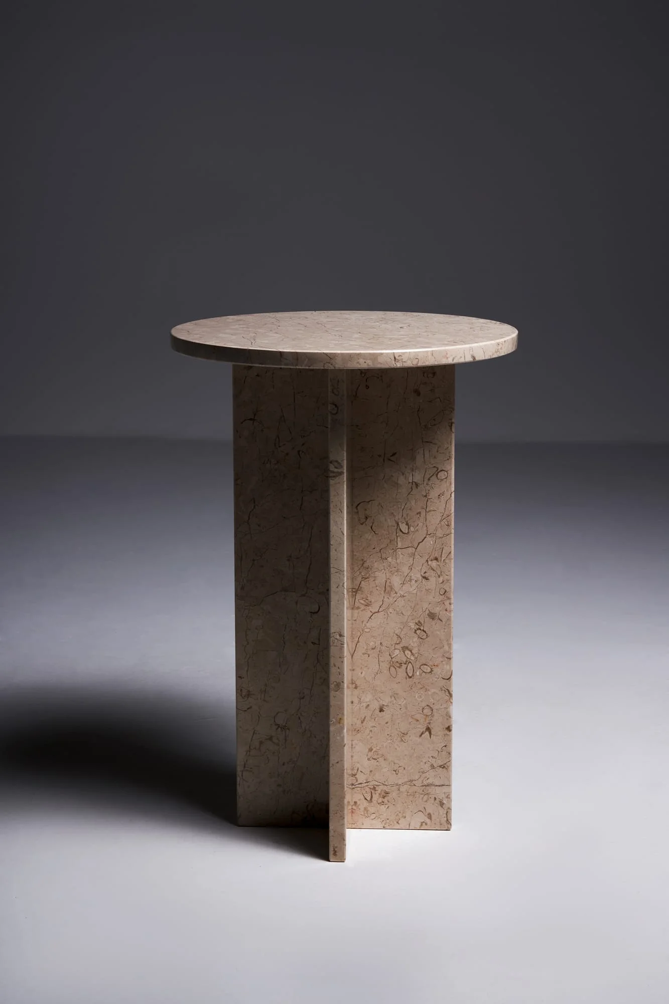 The Mediator in Marble Maya brings a grounded, natural calm into modern spaces. Its soft beige tone is interspersed with fossil-like inclusions that hint at the stone’s geological history. Resting on a cross base made from two solid marble sections, the table is crafted from 100% natural stone with a surface thickness of 2 to 2.5 cm – shaped and polished by hand. Whether in a bedroom, a reading nook or an entryway, the Mediator Maya adds tactile softness and quiet elegance to its surroundings
