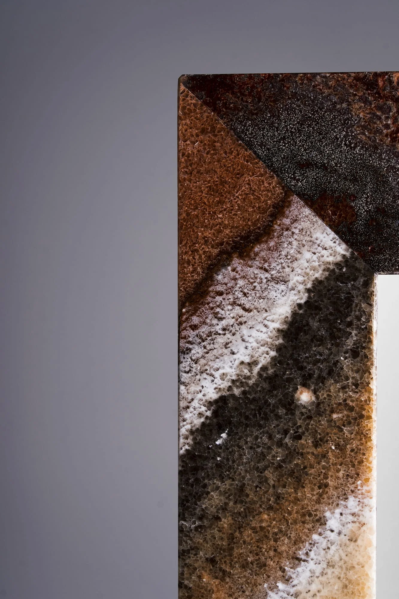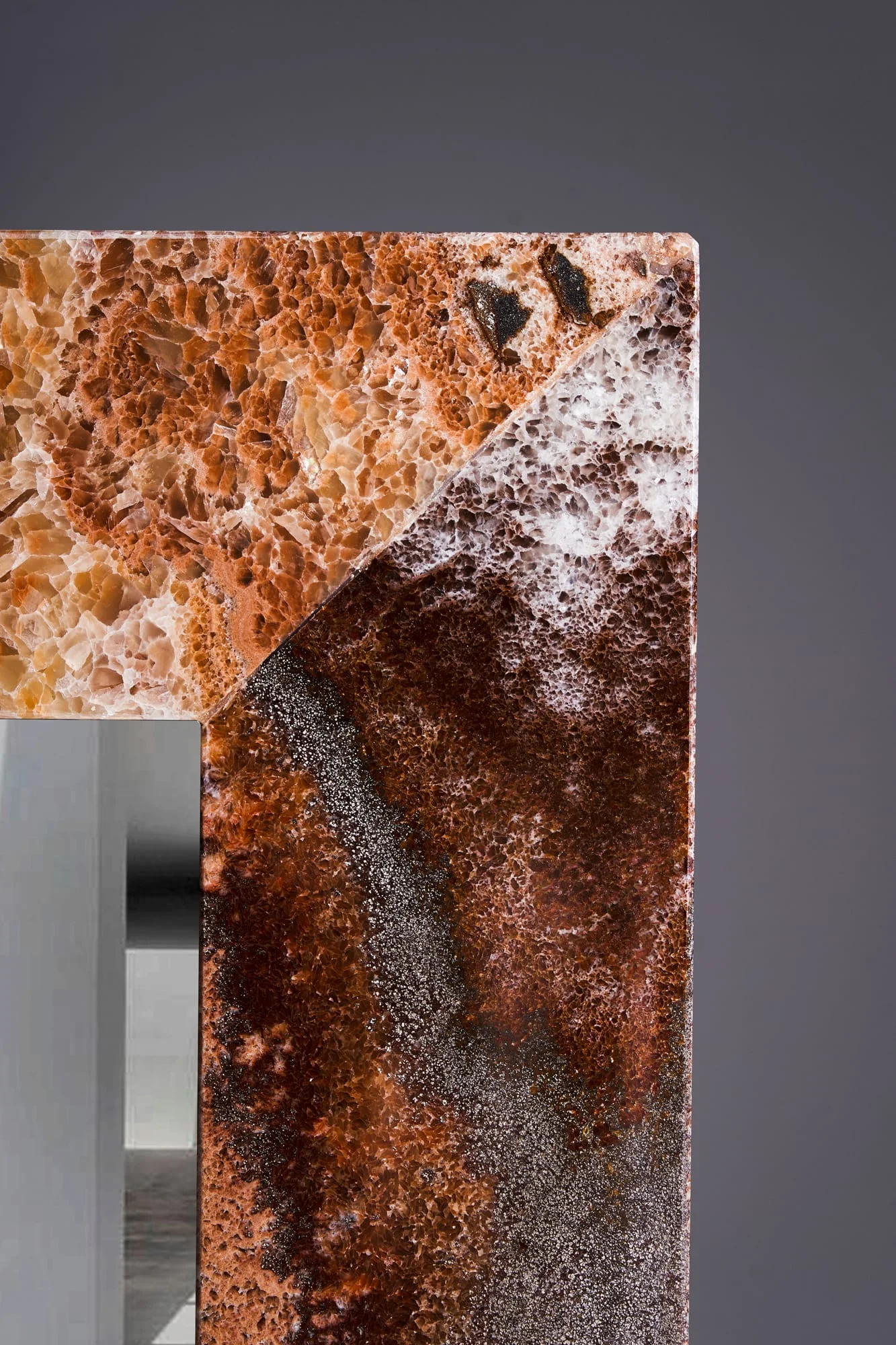 The Multicolor Onyx version is especially distinctive: a natural stone with vivid color gradients in pink, brown, black, grey and deep red patterns. Its organic structure and warm tones make it a true statement mirror for contemporary interiors.